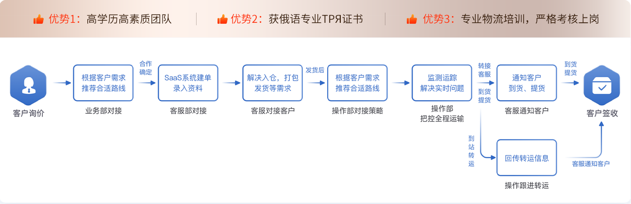 提供一站式俄语国际物流供应链服务,包括双清专线,收汇结汇,出口报关,代理退税,国际运输,口岸转关,境外清关,俄罗斯海外仓,境外配送等。